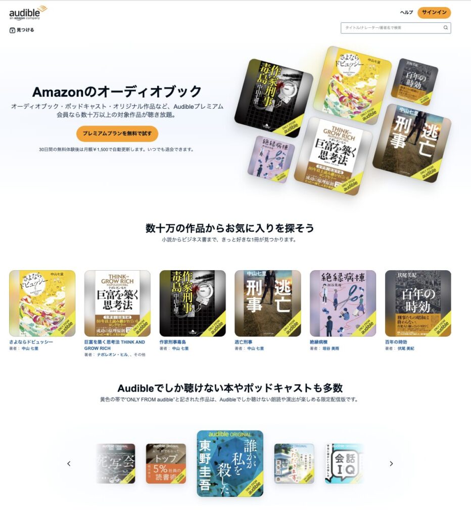 幅広いジャンルで20万以上の作品数を誇るAmazonのオーディオブック「Audible」から始めてみましょう。